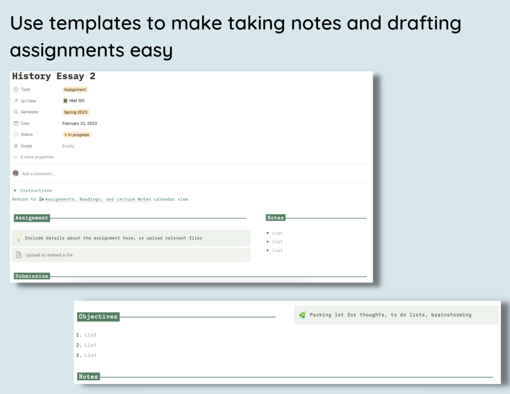 School is already tough enough without having to figure out how to keep track of everything. The Notionaries think you’re in school to learn about your field - not to get good at managing your class workload. We created a template with spaces for everything: readings, lecture notes, assignments, and more. Use everything you need and nothing you don’t. Spend ten minutes setting up your important dates/assignments and never get caught off guard again. Link lecture notes, discussions, and reading to specific tests or quizzes. Connect everything (like a a second brain!) and find it all with a click. And do it not for just your hardest class, but every single class you have.